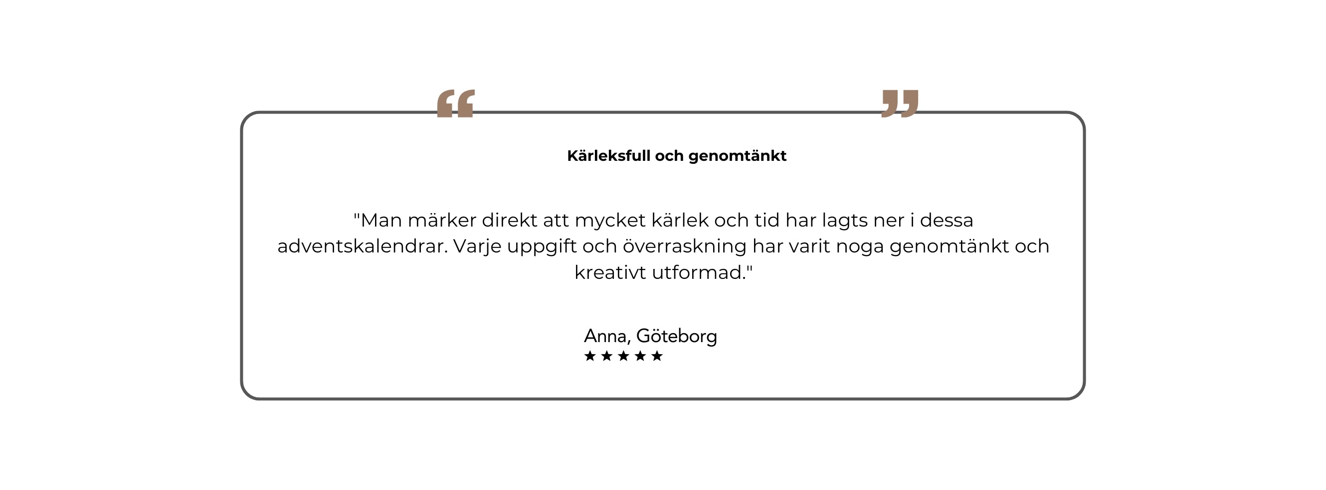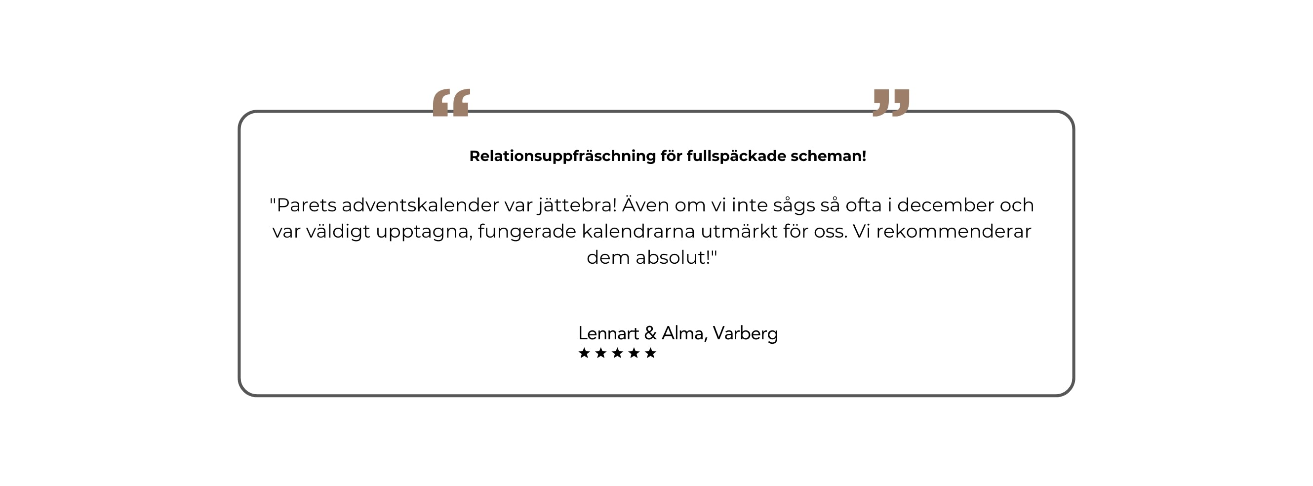 Parets adventskalender är designad med det viktigaste redan ordnat. Det är en liten sak men gör stor skillnad! Vårt motto: att koppla av under julen ger enorm glädje.