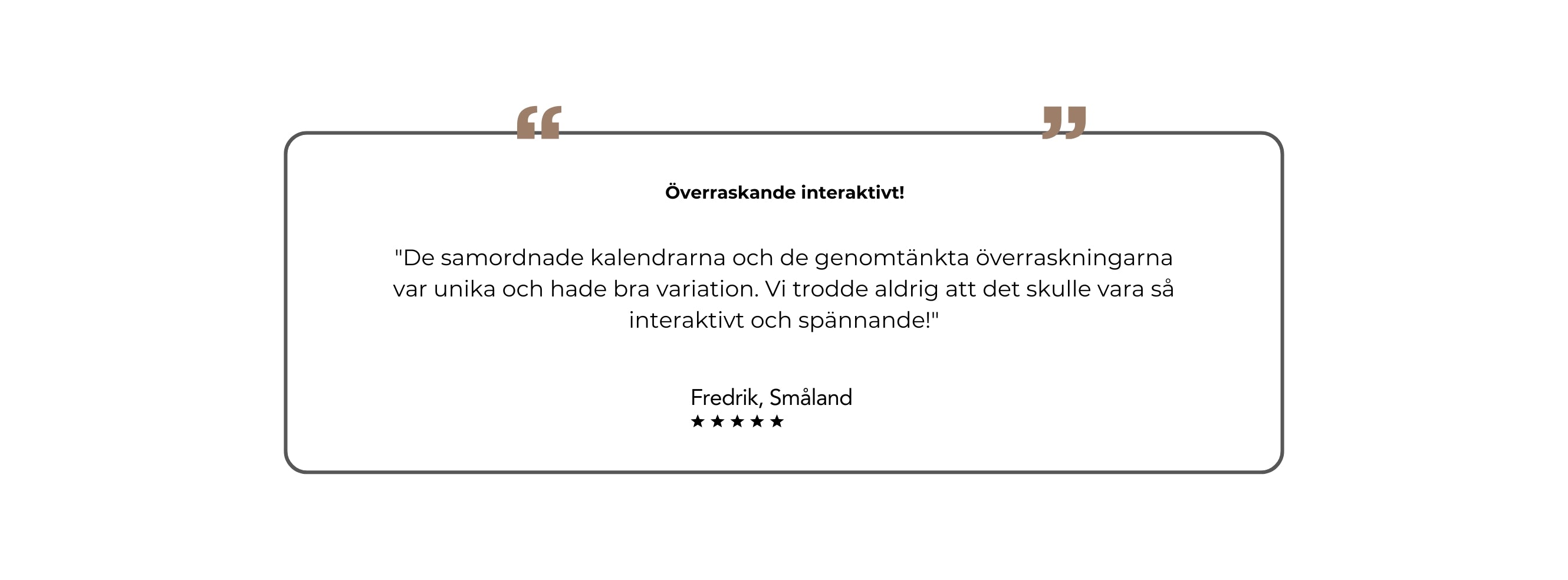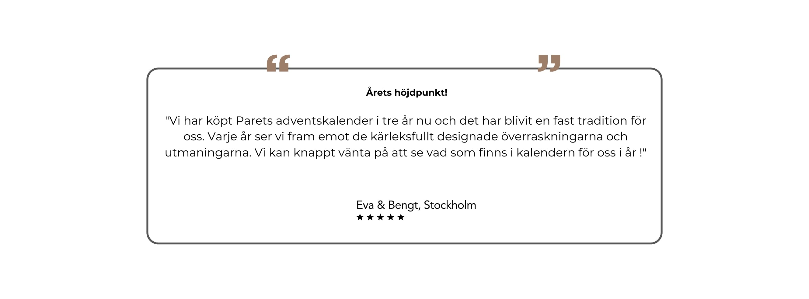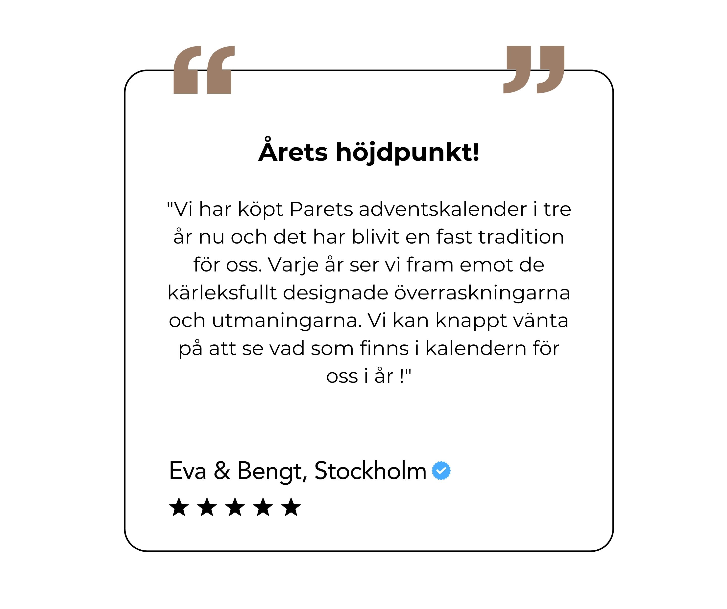 Parets adventskalender är designad med det viktigaste redan ordnat. Det är en liten sak men gör stor skillnad! Vårt motto: att koppla av under julen ger enorm glädje.