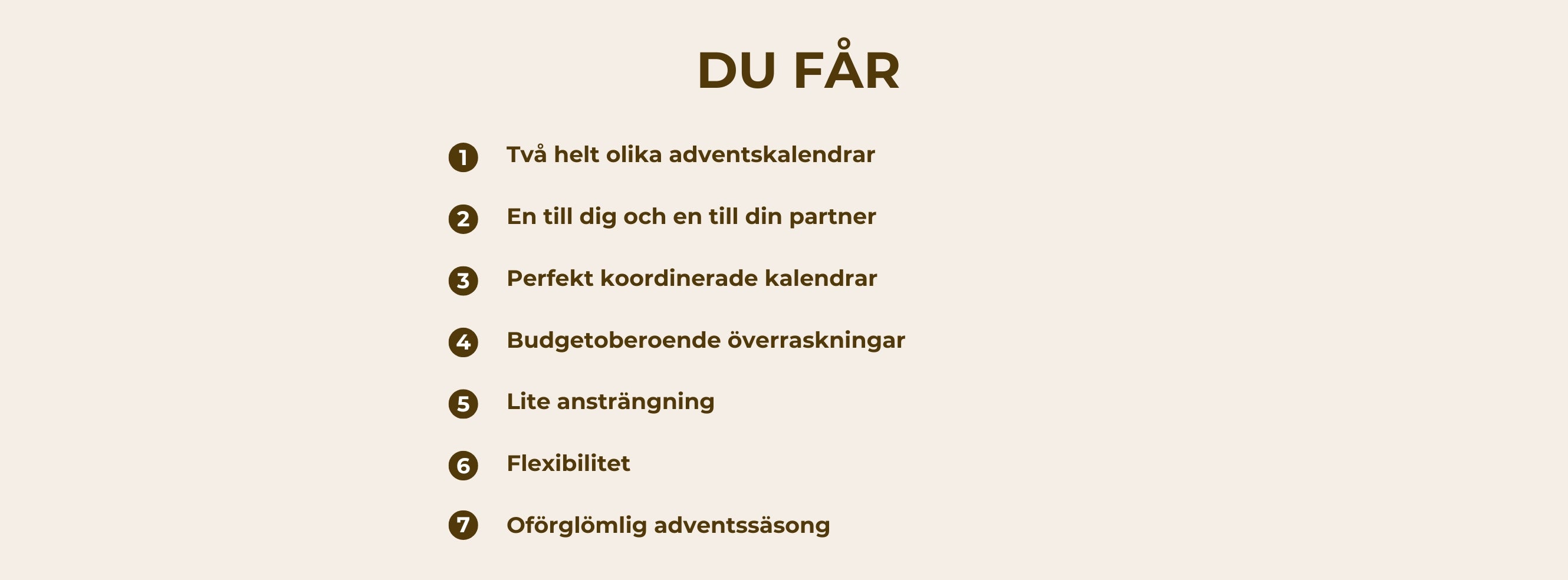 Du får inte bara en, utan två olika, perfekt koordinerade adventskalendrar: en för dig och en för din partner. Om ni är ett äventyrligt par, ta en titt på våra paket.